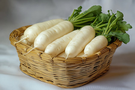 Freshly harvested white radishes and greens arranged in a woven basket on a light background showing natural produce