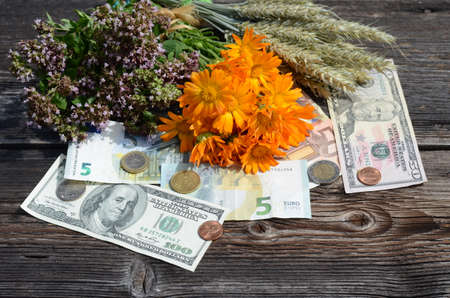 health is money - medical herbs and money concept. Euro and dollar banknotes