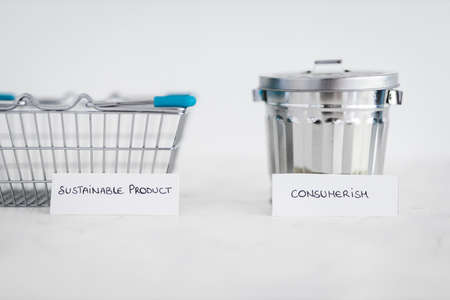 consumerism vs sustainable products and intentional shopping conceptual image, shopping basket for good to be purchased next to recycling bin for excess goods being produced or bought with labels