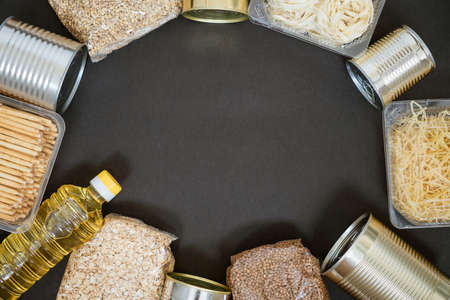 various products, fruits, pasta, sunflower oil in a plastic bottle and preservation, top view. Donation concept, copy space