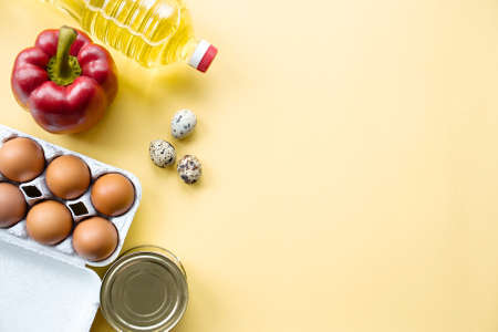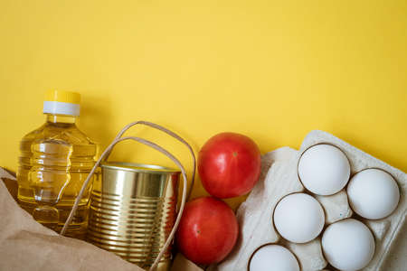 Food stocks crisis food stocks for the period of sanctions. Canned food, eggs, sunflower oil, buckwheat sugar on a yellow background.