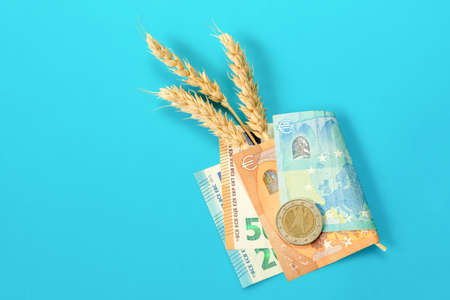 Three ripe wheat ears wrapped in euro banknotes on a blue background. Increasing the cost of bread, the Global food, wheat, grain crisis concept