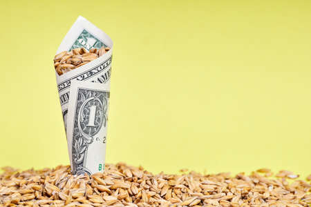 A rolled up dollar bill with barley grains sprinkled into it on a yellow background