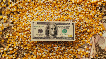 A dollar bill rests on a mound of corn, a staple ingredient in many cuisines. Corn is a natural food that grows from seeds and is used in various dishes as a versatile and nutritious grain