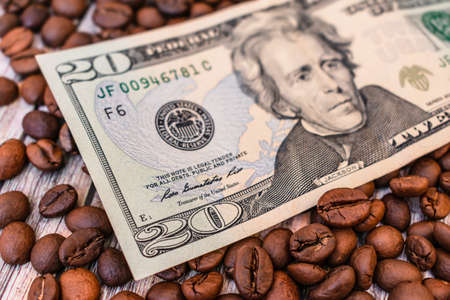 A banknote lies on the grains of roasted coffee, symbolizing the rise in price or reduction in the cost of natural coffee. Twenty dollars lie on grains of natural coffee
