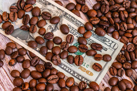 Coffee beans lie on top of the money. The concept of trade in coffee products. Coffee beans lie on a twenty dollar bill