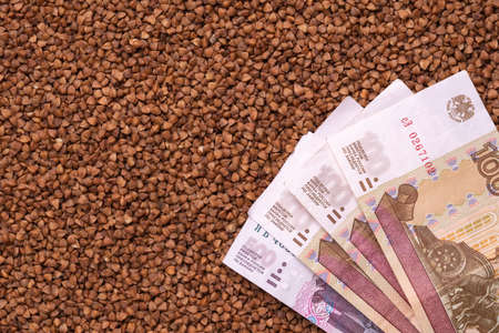 Buckwheat prices. World food crisis. Financial derivatives market. One hundred dollar bill in buckwheat.