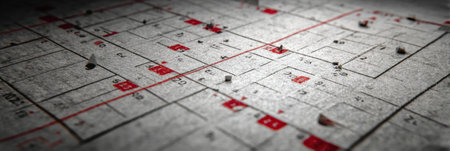 Grid pattern features red markings and scattered debris, creating an intriguing composition in low lighting.