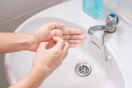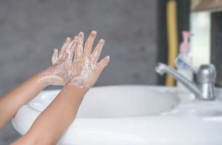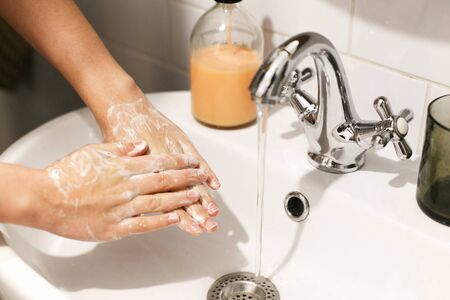 Washing hands with soap and hot water at home bathroom sink women cleansing hand hygiene for coronavirus outbreak prevention. Corona Virus pandemic protection by washing hands frequently.