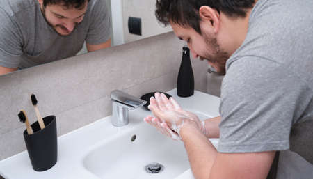 People and body care. Close up man washing hands in a bright bathroom with water, soap and foam under faucet. Everyday hygiene procedures