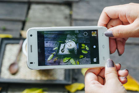 Close up - Woman hand taking photo with smartphone in bakery shop. Camera eat first.