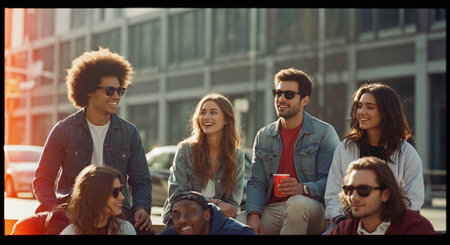A group of young adults sitting together outdoors, smiling and enjoying each others company, wearing casual clothing and sunglasses, with a city backdrop