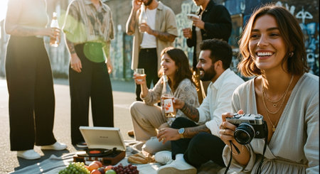 A group of friends enjoying a picnic outdoors, smiling and laughing, with a vintage camera in hand, surrounded by fruits and drinks, a record player nearby