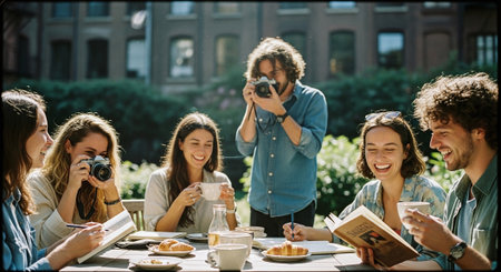 A group of friends enjoying a sunny outdoor brunch, smiling and taking photos, with coffee and pastries on the table
