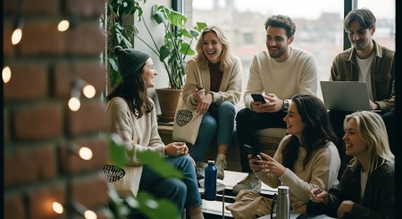 A group of friends enjoying coffee together in a cozy indoor setting, with large windows allowing natural light, casual attire, and a relaxed atmosphere