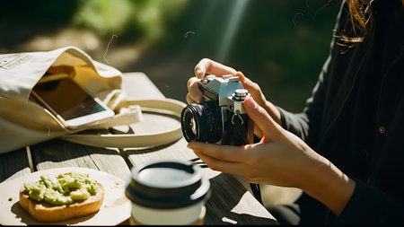 Young woman taking a photo of her breakfast with a vintage camera.