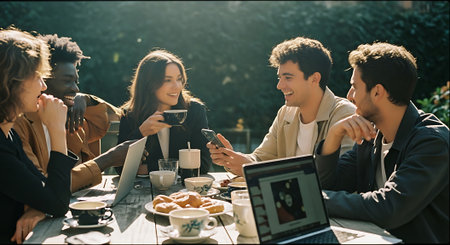 A group of diverse young adults collaborating and socializing outdoors with laptops and coffee
