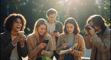 A group of young adults using their phones and taking photos outdoors