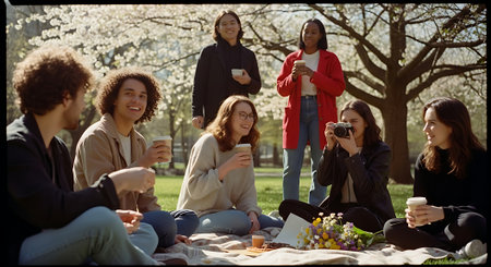 A group of seven young adults relax and socialize on a blanket in a park with blooming trees, enjoying drinks and each other's company on a sunny day.