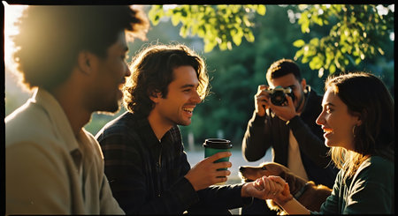 A group of friends are gathered outdoors, smiling and chatting while one person takes a photo and another enjoys a cup of coffee on a sunny day.