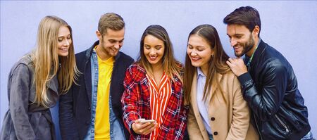 Young people using smartphones - Group of social media co workers having fun with online video photo - Technology obsession