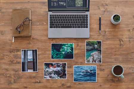 Minimal background composition of printed photographs and laptop on textured wooden desk, photographers office, copy space
