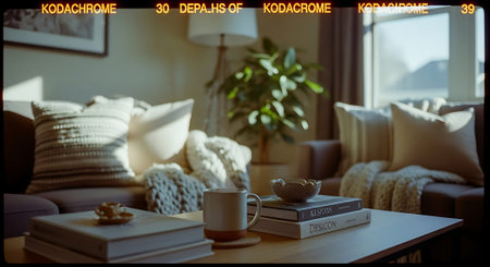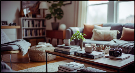 A warm, inviting living room with a coffee table featuring books, a camera, mugs, and plants. Comfortable seating and natural light create a relaxing atmosphere.