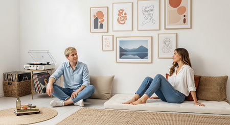 A man and woman sitting on the floor in a minimalist living room with framed artwork on the wall and a woven basket nearby.