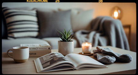 A cozy living room setup with an open book, coffee cup, candle, and potted plant on a wooden table. Soft lighting and comfortable pillows create a relaxing atmosphere.