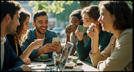 A diverse group of young people laughing and interacting with smartphones and notebooks while enjoying coffee on a sunny day.