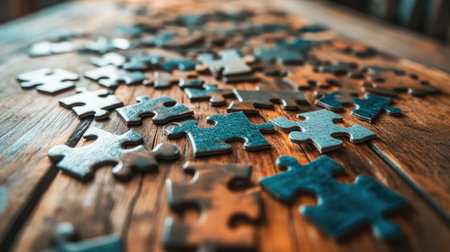scattered puzzle pieces with one in focus, created with generative ai
