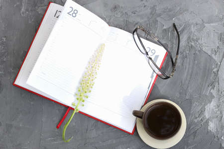 Comfortable and cozy workspace with diary book, coffee mug, decor and copy space on white table. Reading, writing table.