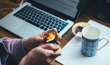 Teleworking workday from home concept with woman eating boiled egg typing working laptop during coronavirus worldwide confinement pandemic