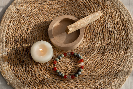 Palo santo for aromatherapy and a natural beaded bracelet. Neutral colored dish made from natural materials. The warm textures and earthy tones create a peaceful and inviting atmosphere.