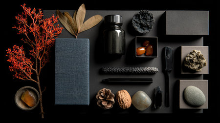 An overhead composition presents a collection of diverse objects against a dark backdrop. The arrangement showcases elements in shades of gray, orange, and brown, with touches of green. The lighting appears soft, creating gentle shadows. This could be used for conceptual design, product showcases, or visual content.