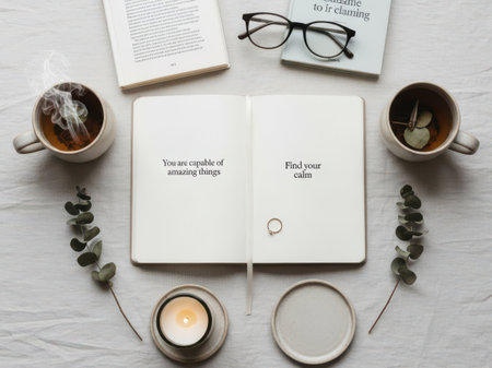 A serene flat lay featuring a cup of tea, open journal, pen, affirmation cards, candle, and lavender, promoting relaxation and mindfulness.