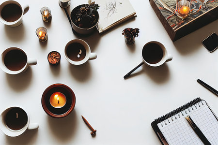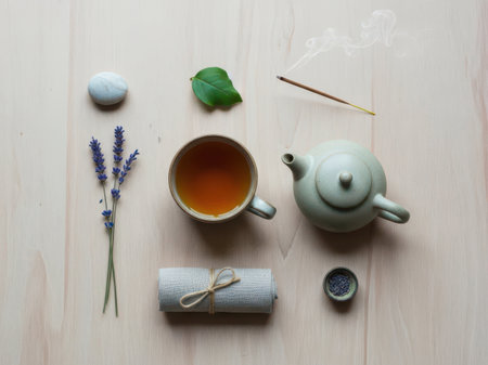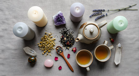 Overhead shot of a still life arrangement including tea set, crystals, candles, flowers, and herbs. Wellness concept promotes relaxation, spiritual practice and inner peace through holistic approach. Relaxing environment. AI Generative AI generated