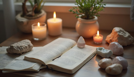 Open book and scattered crystals lit by candles create a serene atmosphere on a wood table Ideal for wellness and mindful living concepts.