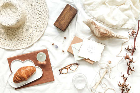Trendy and stylish flat lay with woman accessories, hat, glasses, letters and croissant. Lifestyle and blogg concept.