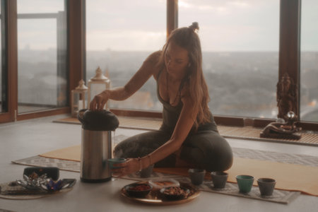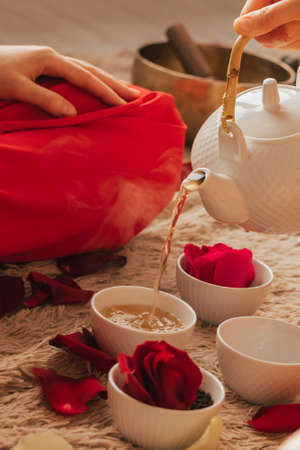 Two women sit on the floor and drink tea from herbs and flowers. Tea ceremony during relaxation, relaxation, mental health, harmony