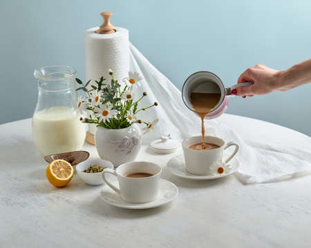 Breakfast is served on a table with light blue background. Breakfast setting over blue table with copy space border. Coffe with milk. Flat lay