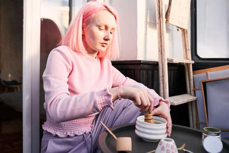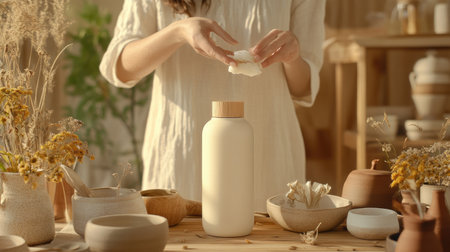 A woman gently prepares natural ingredients in a serene and cozy organic setting, surrounded by rustic pottery and dried flowers, showcasing a calming lifestyle.