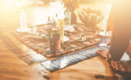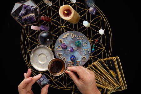 Fortune Telling Table with tarot cards and esoteric objects. Fortune-teller guessing from coffee grounds