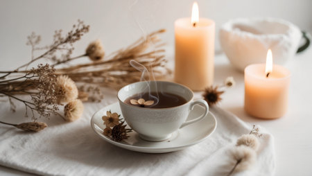 A warm and inviting scene features a steaming cup of tea nestled on a wooden tray. A red candle flickers beside it, surrounded by dried flowers, creating a serene atmosphere.