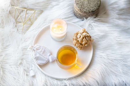 Cozy home desk table with plaid, coffee cup, candle High quality 2d illustration.