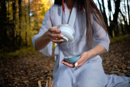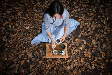 A girl in a blue kimono sits in the autumn forest and prepares tea