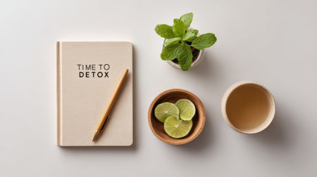 Notebook with detox plan, pen, fresh mint, lime slices, and herbal tea create a healthy and refreshing scene, promoting wellness and a mindful approach to cleansing