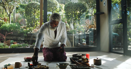Incense, alternative medicine and mature man on floor for spiritual meditation, holistic treatment and healing. Aromatherapy, cleanse and person with stones for balance, chakra and detox for wellness