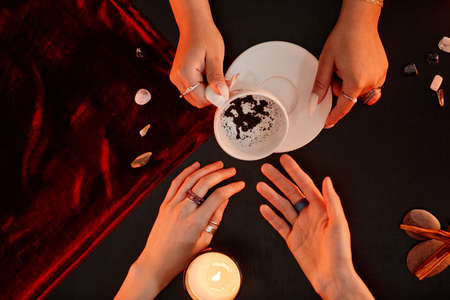 Top down view at female fortune teller reading coffee telling destiny in seance with young woman, copy space