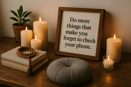 Serene meditation setup featuring glowing candles, a framed motivational quote, a small plant, and a cushion, promoting tranquility and mindfulness